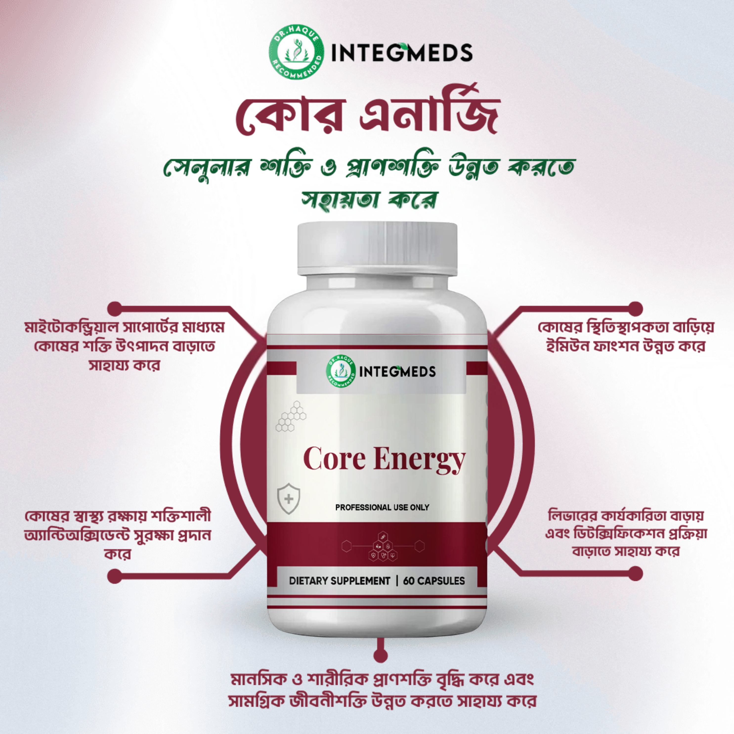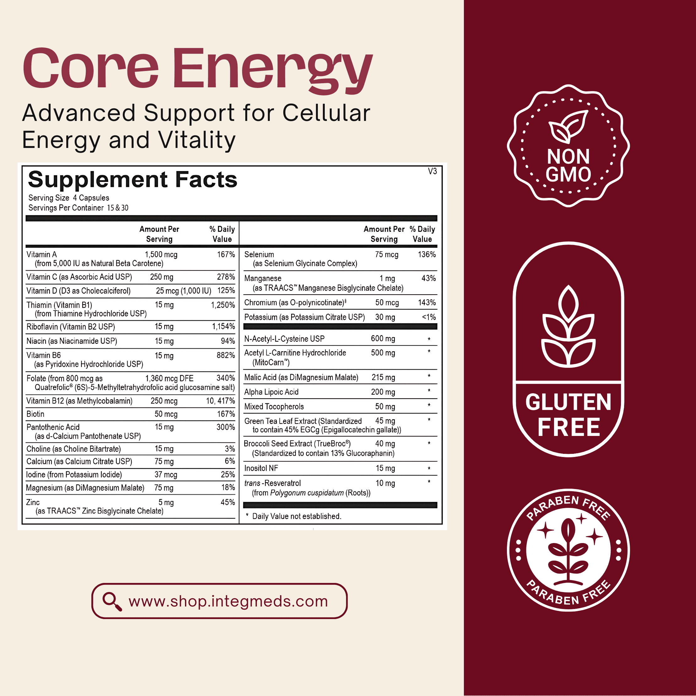 মাইটোকন্ড্রিয়াল রিজার্ভ বাড়াতে এবং সেলুলার শক্তি উত্পাদন রিচার্জ করার জন্য প্রকাশিত গবেষণার উপর ভিত্তি করে কোর এনার্জি বৈজ্ঞানিকভাবে প্রণয়ন করা হয়েছে। কোর এনার্জিতে আলফা লাইপোইক অ্যাসিড, এন-এসিটাইল সিস্টাইন এবং এসিটাইল এল-কার্নিটাইনের শক্তিশালী অ্যান্টিঅক্সিড্যান্ট ত্রয়ী অন্তর্ভুক্ত রয়েছে, যা সমস্ত সেলুলার শক্তি উত্পাদন এবং ভিটামিন ই, সি এবং গ্লুটাথিয়নের প্রাথমিক সেলুলার অ্যান্টিঅক্সিডেন্ট পুলগুলি রিচার্জ করতে দেখানো হয়েছে। কোর এনার্জিতে মাইটোকন্ড্রিয়া রক্ষা করতে এবং শক্তি উত্পাদনের চক্রটি ক্রমাগত পুনর্নবীকরণের জন্য গ্রিন টি, ব্রোকলি বীজ নিষ্কাশন এবং রেসিভেরট্রোল সহ মূল মাইক্রোনিউট্রিয়েন্টস এবং ফাইটোনিউট্রিয়েন্টসও অন্তর্ভুক্ত রয়েছে।
