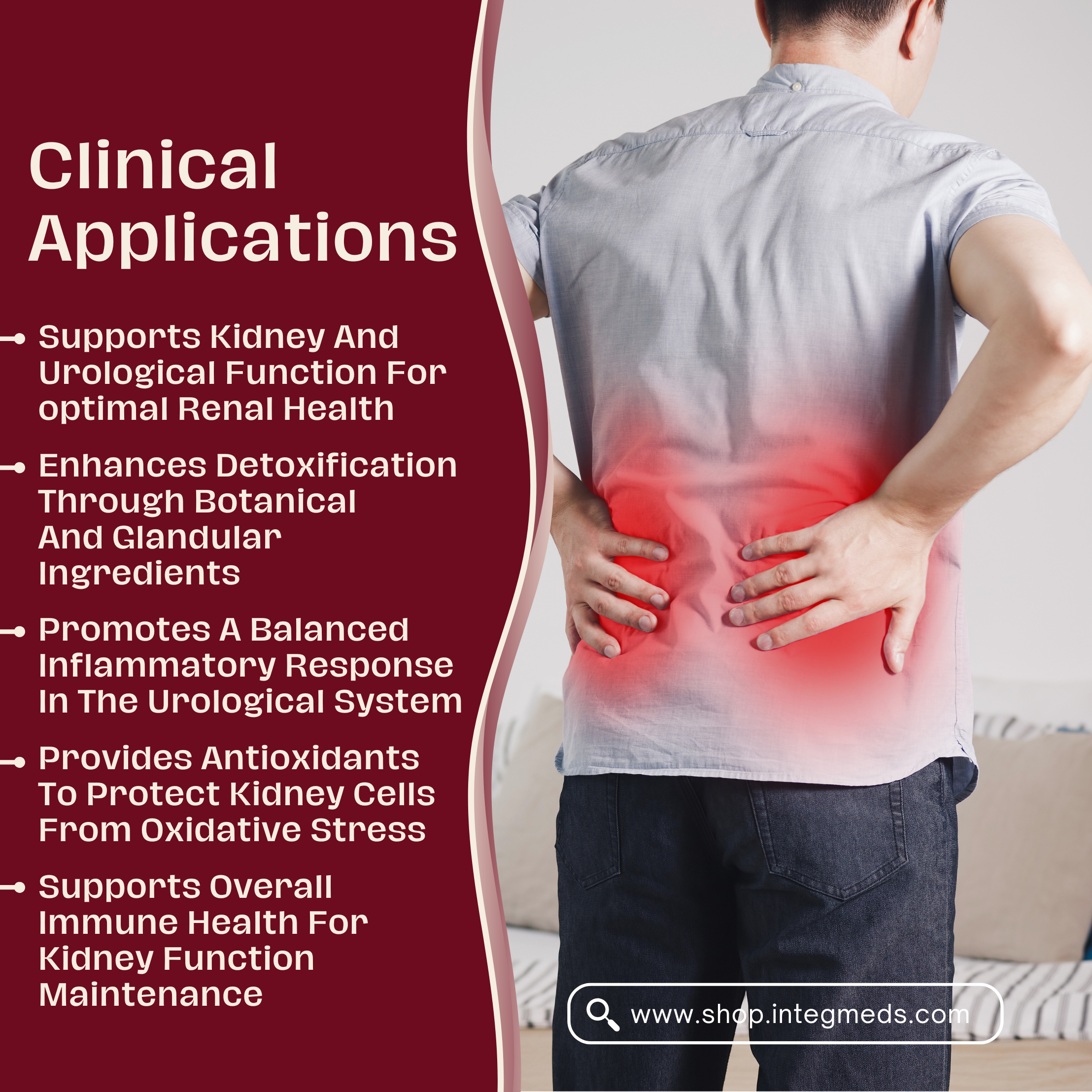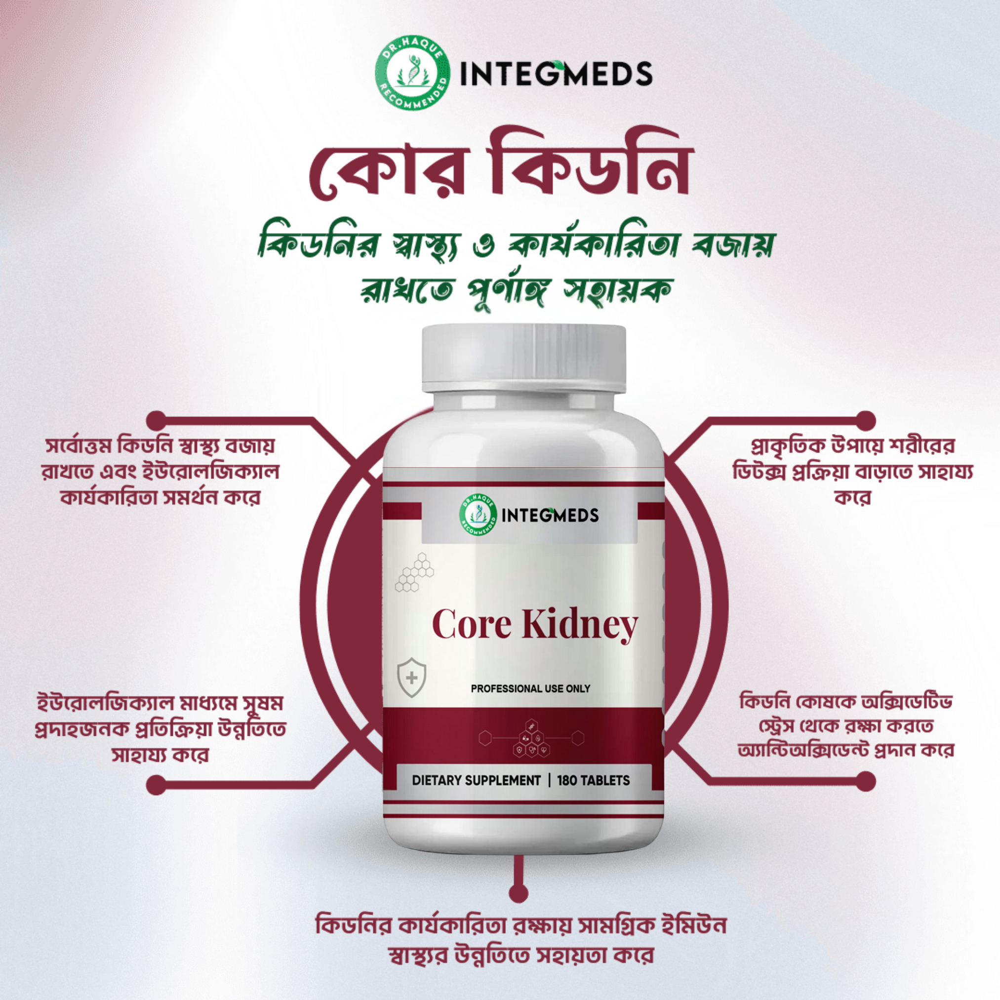 কোর কিডনি ইউরোলজিকাল সিস্টেমের জন্য সর্বোত্তম পুষ্টি সহায়তা সরবরাহ করে এবং একটি অনন্য বোটানিকাল মিশ্রণে নির্দিষ্ট ভিটামিন, খনিজ এবং নবজাতক গ্রন্থিগুলি অন্তর্ভুক্ত করে। এটিতে বোটানিকাল উভা উরসি (আর্কটোস্টাফিলোস উভা উরসি), বুচু পাতা (আগাথোসমা বেটুলিনা), এচিনেসিয়া (এচিনেসিয়া অ্যাঙ্গুস্টিফোলিয়া), এবং ক্র্যানবেরি রয়েছে, পাশাপাশি নবজাতক কিডনি (গবাদি পশু), নবজাতক থাইমাস (গবাদি পশু), এবং নবজাতকের লিভার (গবাদি পশু) অঙ্গ সমর্থন করার জন্য।