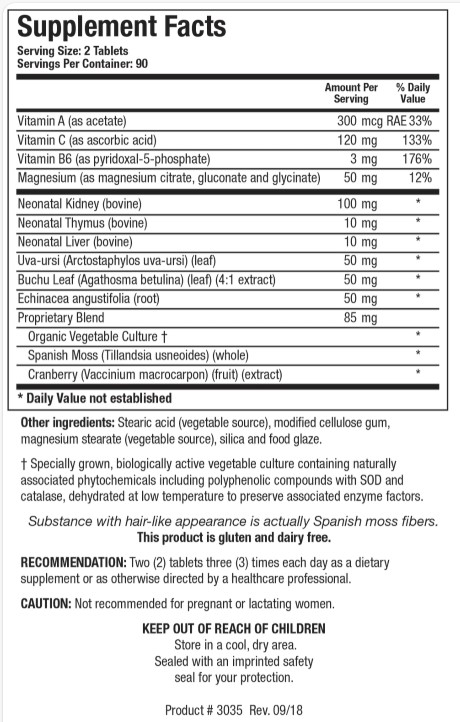 ভিটামিন এ (অ্যাসিটেট হিসাবে); ভিটামিন সি (অ্যাসকরবিক অ্যাসিড হিসাবে); ভিটামিন বি 6 (পাইরিডক্সাল -5-ফসফেট হিসাবে); ম্যাগনেসিয়াম (ম্যাগনেসিয়াম সাইট্রেট, গ্লুকোনেট এবং গ্লাইসিনেট হিসাবে); নবজাতকের কিডনি (গবাদি পশু); নবজাতক থাইমাস (গবাদি পশু); নবজাতকের লিভার (গবাদি পশু); উভা-উরসি (আর্কটোস্টাফিলোস উভা-উরসি) (পাতা); বুচু লিফ (আগাথোসমা বেটুলিনা) (পাতা) (৪:১ নির্যাস); এচিনেসিয়া অ্যাঙ্গুস্টিফোলিয়া (মূল); মালিকানাধীন মিশ্রণ, জৈব উদ্ভিজ্জ সংস্কৃতি †, স্প্যানিশ শ্যাওলা (টিল্যান্ডসিয়া ইউসনিওডস) (সম্পূর্ণ); ক্র্যানবেরি (ভ্যাকসিনিয়াম ম্যাক্রোকার্পন) (ফল) (নির্যাস)