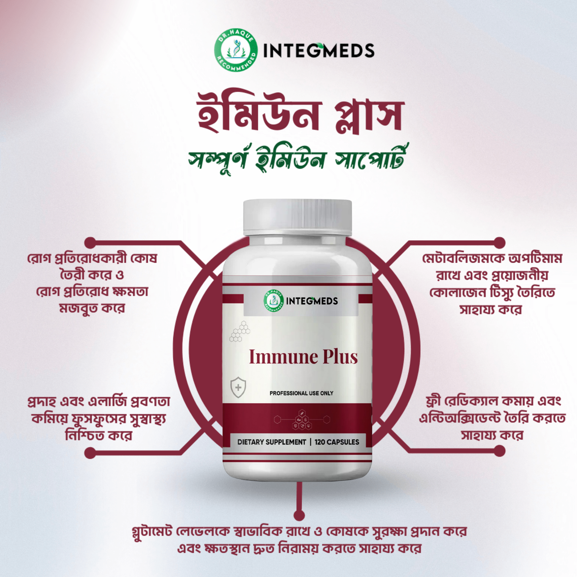 ইমিউন প্লাস হ'ল পুষ্টির একটি লক্ষ্যযুক্ত মিশ্রণ যা শরীরের প্রতিরোধ মজুদগুলিতে বিস্তৃত-বর্ণালী সমর্থন সরবরাহ করার জন্য ডিজাইন করা হয়েছে। সূত্রটিতে কোরেসেটিন অন্তর্ভুক্ত রয়েছে, একটি শক্তিশালী বায়োফ্লাভোনয়েড যা প্রতিরোধ ক্ষমতা সমর্থন করতে সহায়তা করে। ভিটামিন সি এবং এন-এসিটাইল সিস্টাইন শক্তিশালী অ্যান্টিঅক্সিডেন্ট যা শ্বাস প্রশ্বাসের কার্যকারিতা প্রচার করে এবং কোরেসেটিনের কার্যকারিতা সমর্থন করে। ভিটামিন ডি এবং দস্তা একটি শক্তিশালী ইমিউন রিজার্ভ তৈরি করতে প্রয়োজনীয় গুরুত্বপূর্ণ মাইক্রোনিউট্রিয়েন্টস। এই শক্তিশালী সংমিশ্রণটি স্বাস্থ্যকর শ্বাসযন্ত্র এবং প্রতিরোধ ক্ষমতা প্রচার করতে কাজ করে।