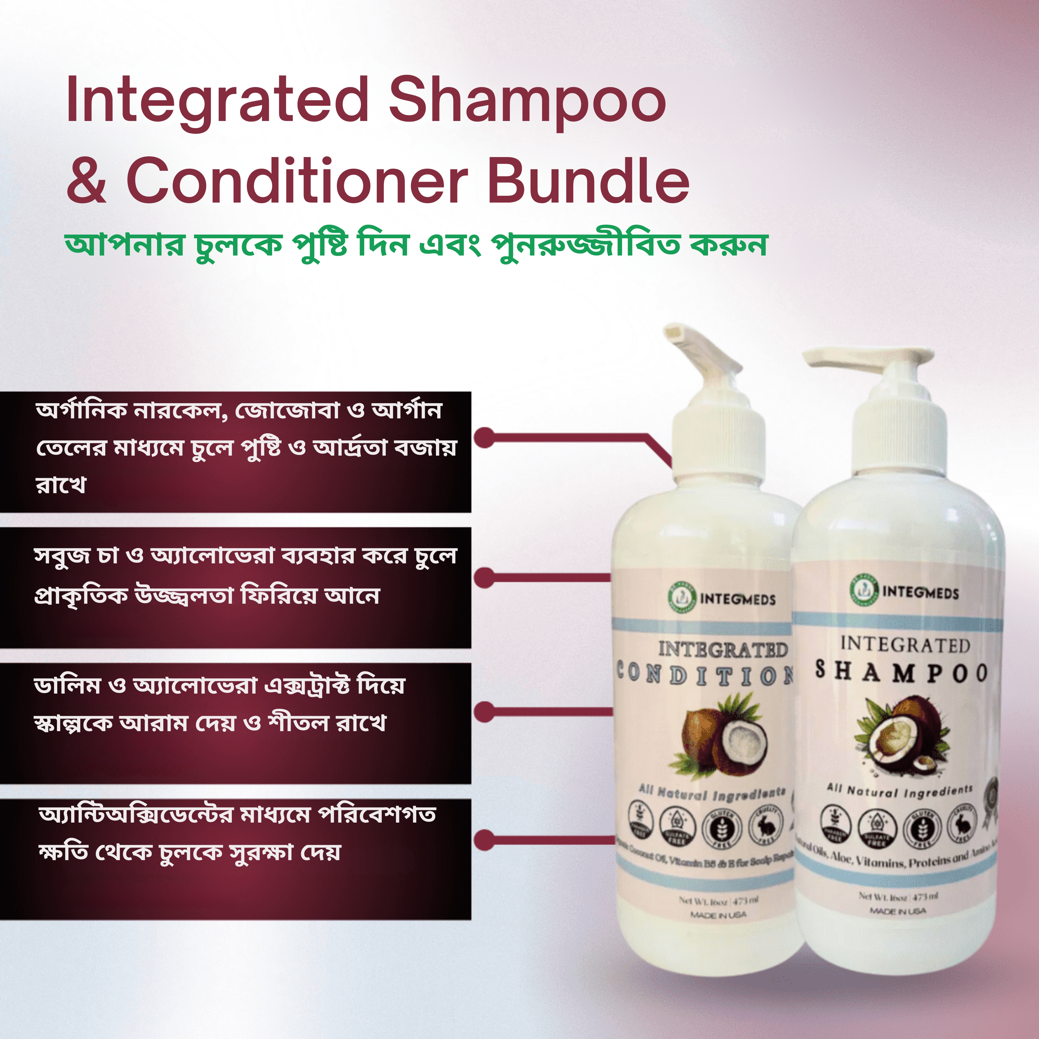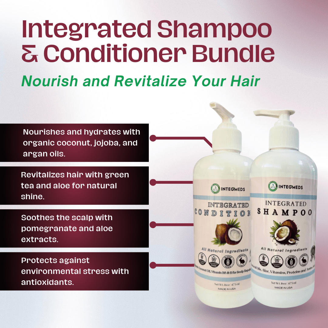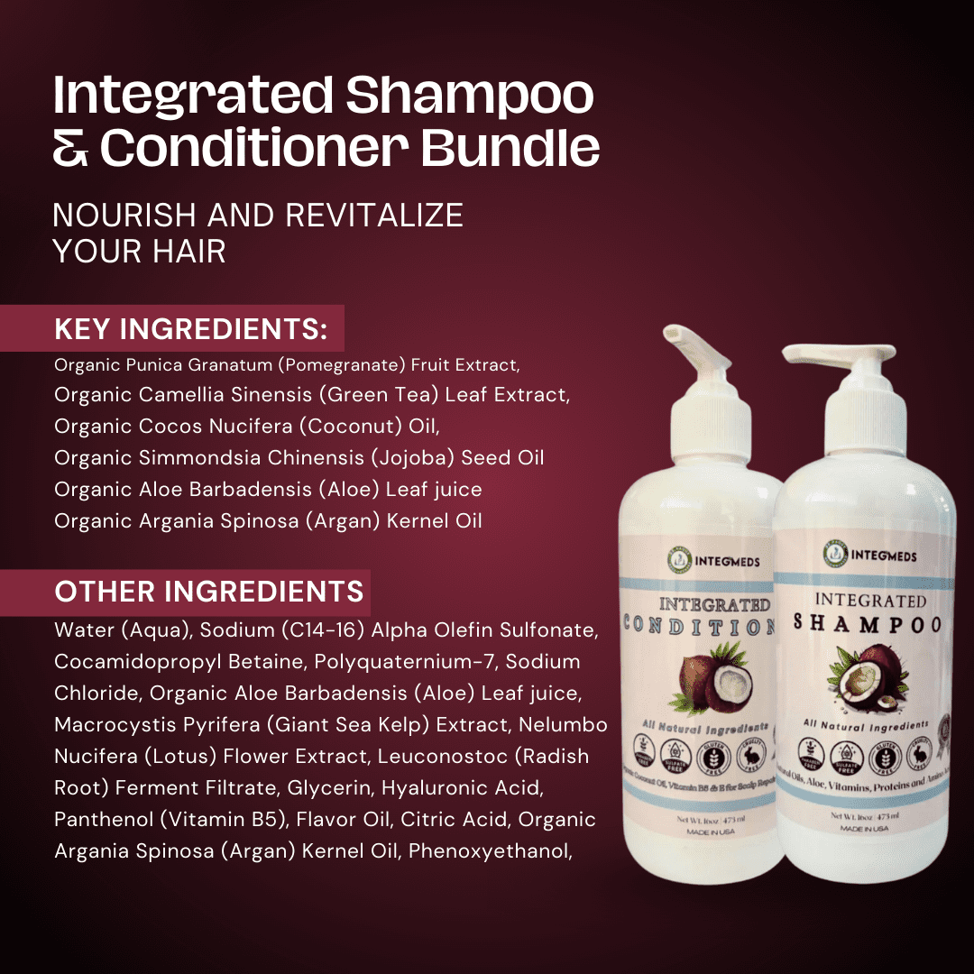 ইন্টিজিএমইডিএস অর্গানিক নারকেল তেল শ্যাম্পু এবং কন্ডিশনার বান্ডেল বৈজ্ঞানিকভাবে সমর্থিত চুলের স্বাস্থ্য সুবিধার সাথে সেরা প্রাকৃতিক উপাদানগুলিকে একত্রিত করে একটি রূপান্তরকারী চুলের যত্নের অভিজ্ঞতা সরবরাহ করে। প্রতিটি উপাদান আপনার চুলকে পুষ্ট, হাইড্রেট এবং সুরক্ষিত করার জন্য চিন্তাভাবনা করে বেছে নেওয়া হয়।