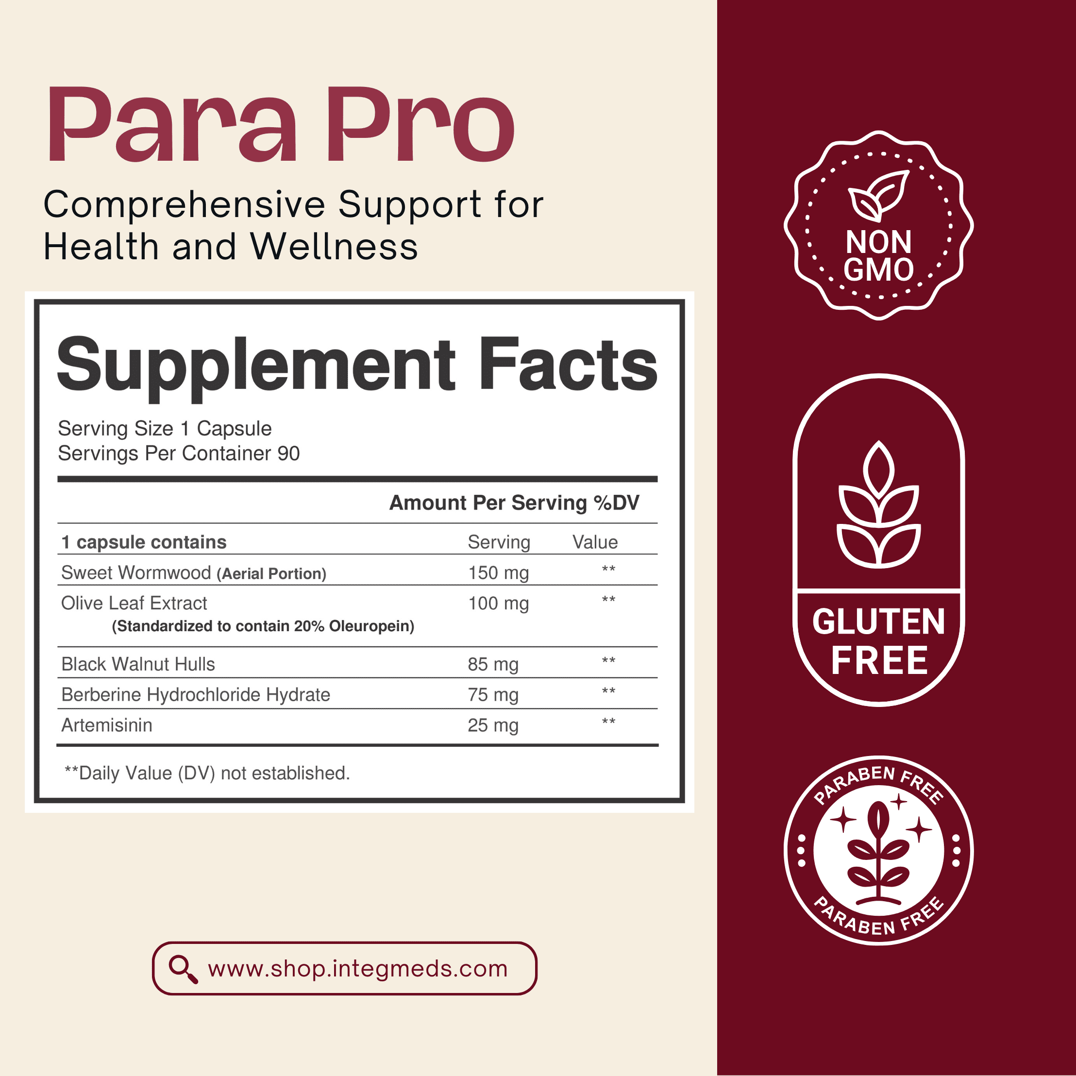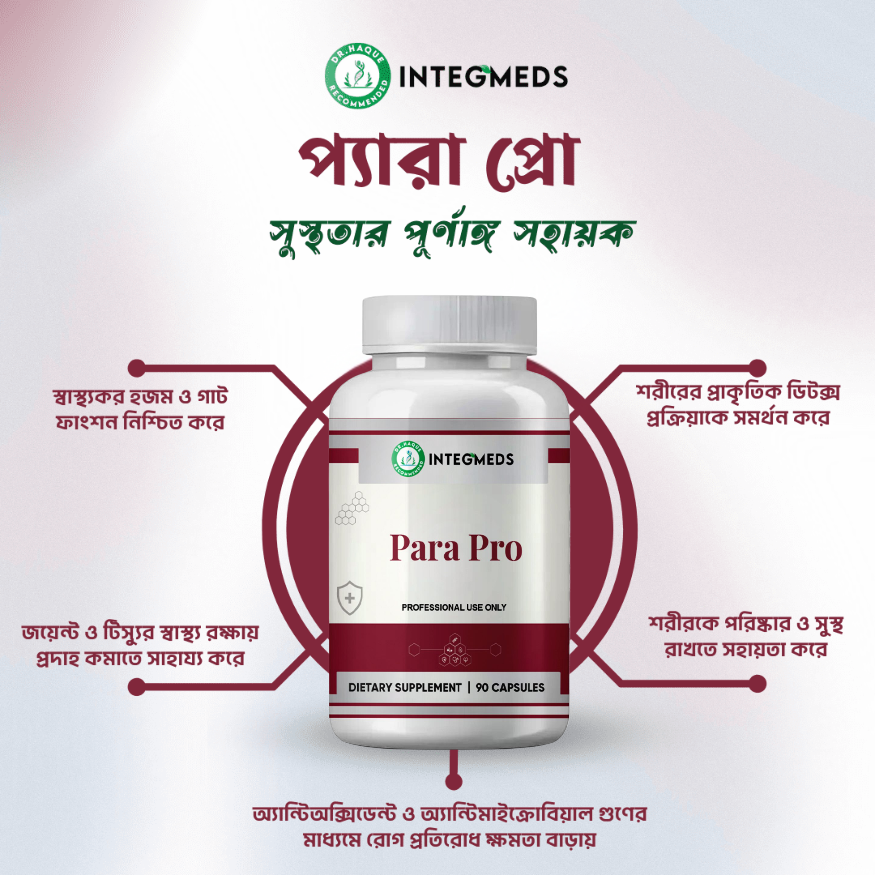 প্যারা প্রো হ'ল একটি ডায়েটরি পরিপূরক যা প্রাকৃতিক উপাদানগুলির মিশ্রণের মাধ্যমে সামগ্রিক স্বাস্থ্য এবং সুস্থতা সমর্থন করার জন্য ডিজাইন করা হয়েছে। এতে মিষ্টি কৃমি কাঠ (150 মিলিগ্রাম), জলপাই পাতার নির্যাস (100 মিলিগ্রাম), কালো আখরোটের হাল (85 মিলিগ্রাম), বারবারিন হাইড্রোক্লোরাইড হাইড্রেট (75 মিলিগ্রাম) এবং আর্টেমিসিনিন (25 মিলিগ্রাম) রয়েছে। এই উপাদানগুলি তাদের উপকারী বৈশিষ্ট্যগুলির জন্য সাবধানে নির্বাচিত হয়। প্যারা প্রো গ্লুটেন, খামির, কৃত্রিম রঙ এবং স্বাদ সহ সাধারণ অ্যালার্জেন মুক্ত হওয়ার জন্য তৈরি করা হয়েছে।