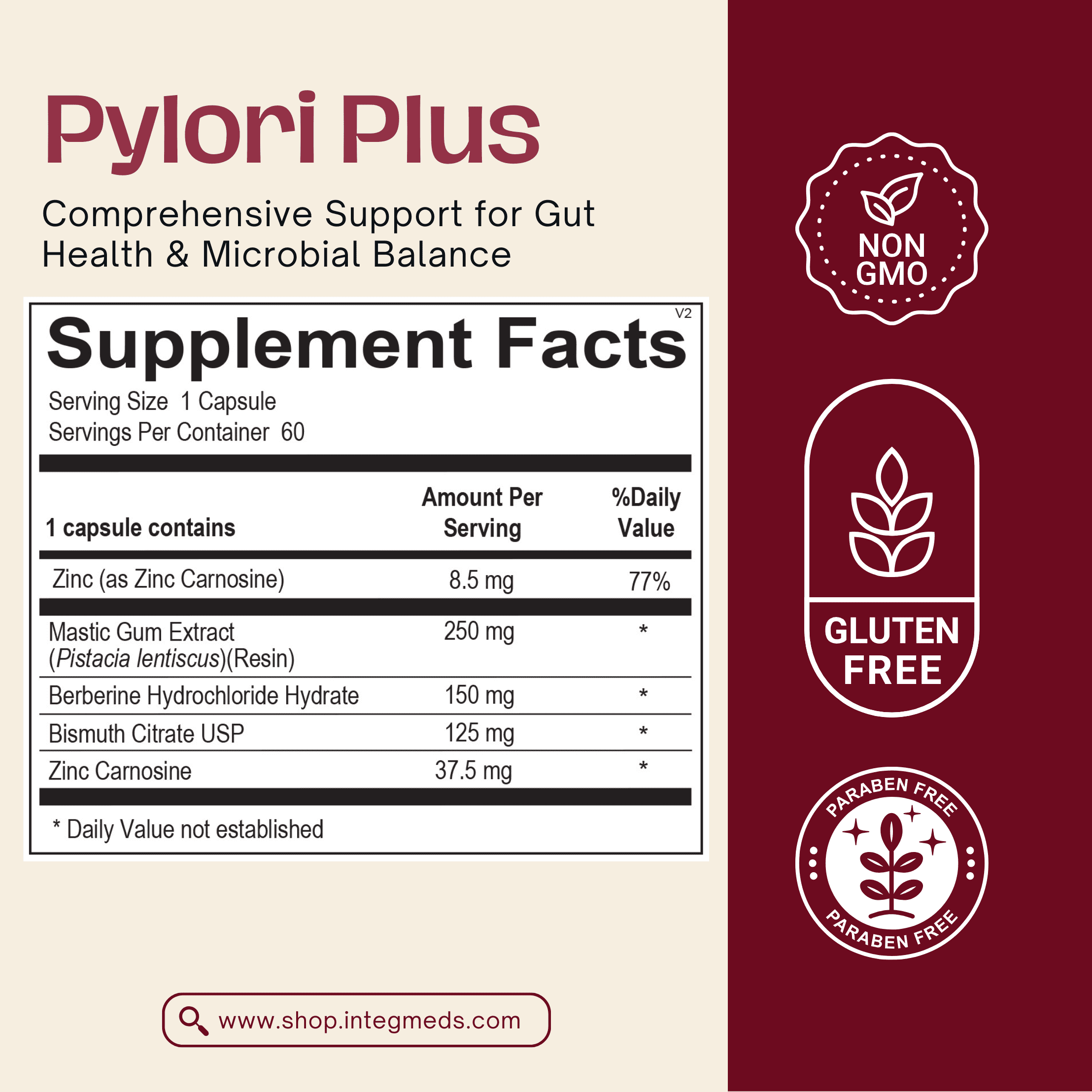 পাইলোরি প্লাসে গ্যাস্ট্রোইনটেস্টাইনাল ট্র্যাক্ট এবং পেটে মাইক্রোবায়াল ভারসাম্য প্রচারের জন্য ম্যাস্টিক গাম, বিসমাথ সাইট্রেট এবং জিঙ্ক কার্নোসিনের মতো উপাদান অন্তর্ভুক্ত রয়েছে।
